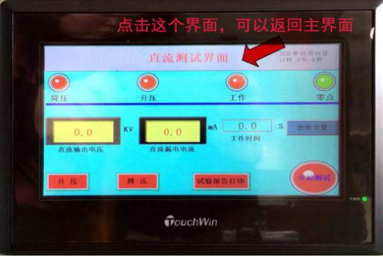 3:參數設定一般只需設定,輸出電壓,泄漏電流,通電時間三個參數即可,其他不要改,設定好參數后,點擊“返回”到主界面,再點擊一下“測試”按鈕,界面“工作”指示燈為紅色并閃爍,升壓指示燈亮,至額定電壓,“升壓”停止并開始計時-計時完成-降壓-主回路斷開。整個耐壓過程將按要求自動完成。并記錄所有參數,點擊“試驗報告打印”將打印測試結果。